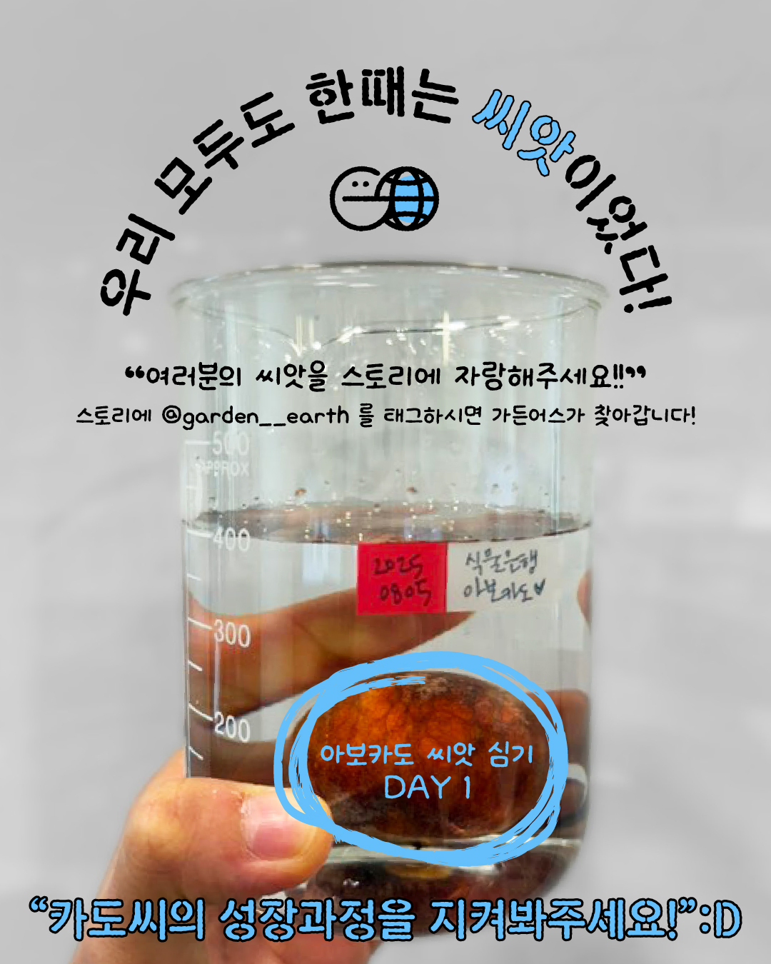 아보카도 씨앗 심기 1일차 🥑어제 아보카도를 먹다가 문득 궁금해졌어요.“이 씨앗 크면 팔 수 있을까? 🤔”그 순간부터 검색 시작!식물 박사님들의 놀라운 실험 기록을 봤는데요,아보카도는 물론, 수박, 심지어 용과까지도 직접 키우셨더라고요🌱그래서 저희도 도전해보기로 했습니다.이 아이의 이름은 카도씨!지수‘씨’, 철수’씨‘, 민지’씨‘, 영희‘씨 ’우리도 한때는 카도씨처럼 씨에 불과했던 미성숙한 존재들이었잖이요👶단단한 씨앗의 벽을 뚫고 싹이 나오는 과정처럼 우리 모두 그 힘든 과정들을 겪으며 지금까지 성장한 것일테지요!🙂우리 모두도 씨앗의 시절이 있었다!👀-씨드부터 꾸준히 키우고 있는 반려식물이 있으신가요?@garden__earth가 매입하겠습니다💪
